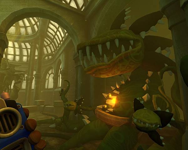 還以為會被巨大植物咬死,結果沒事嘛,果然這遊戲灰暗但也不會血腥暴力,這樣近看大頭植物,我居然有瞬間覺得它可愛,一定是老眼昏花了。溫室關卡要和同伴合力調藥,我在此負責種植作物,同伴則是負責調可以毒死大植物的藥。