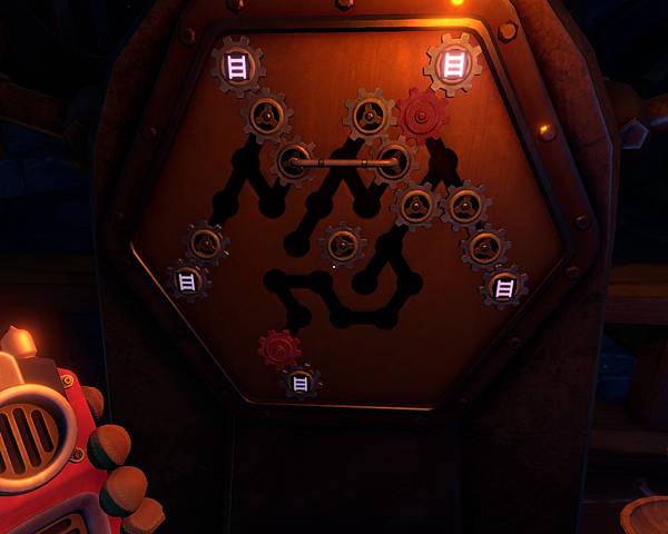 轉齒輪的關卡是在調毒死植物藥之前的,我覺得這是所有關卡裡最讓人搞不懂XDD,之前跟同伴在此卡很久,然後就放置Play好陣子沒有玩哩……雖然知道是對應井水的符號,但怎麼對應當時無法確認排列位置,本來我是卡在井水下方等死的那位,一直到同伴先確認了我下井後天花板的符號位置,才發現有個符號是多出來誤導的。只要扣掉那個符號,並且想辦法讓齒輪與中間的齒輪碰到,每個階梯就會轉動,另一端的同伴也不會淹死了。